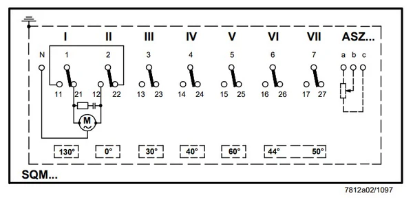 The Siemens SQM10 is a reversible electromotoric actuator designed for the precise control of air dampers and valves in oil burners. This specific configuration offers a nominal torque of 10 Nm and a running time of 42 seconds for a 130 degree rotation. It features a locking-proof synchronous motor and a maintenance-free gear train with self-lubricating bearings, housed within an impact-proof, heat-resistant plastic cover. The actuator includes a disengagement lever for manual adjustment and allows for switching point customization via adjustable cams.